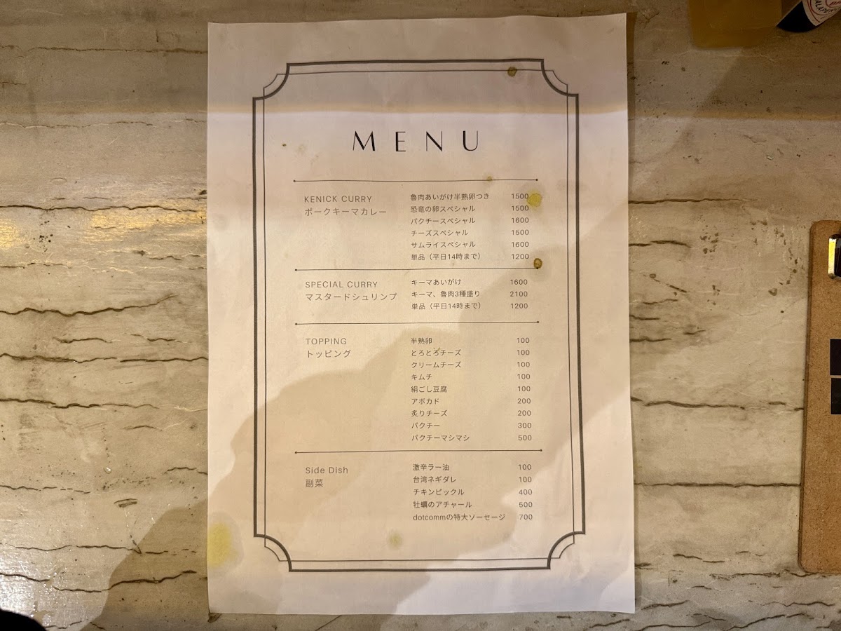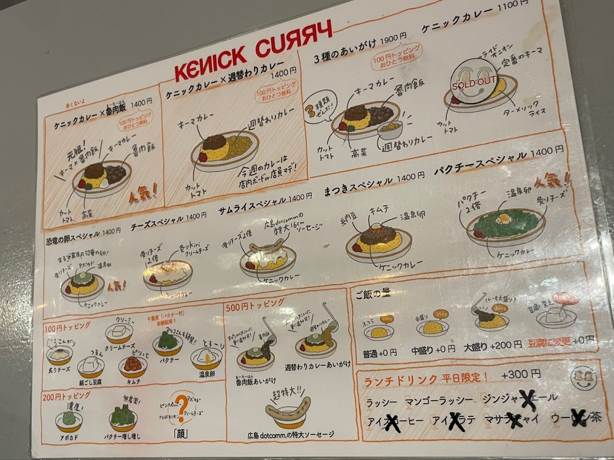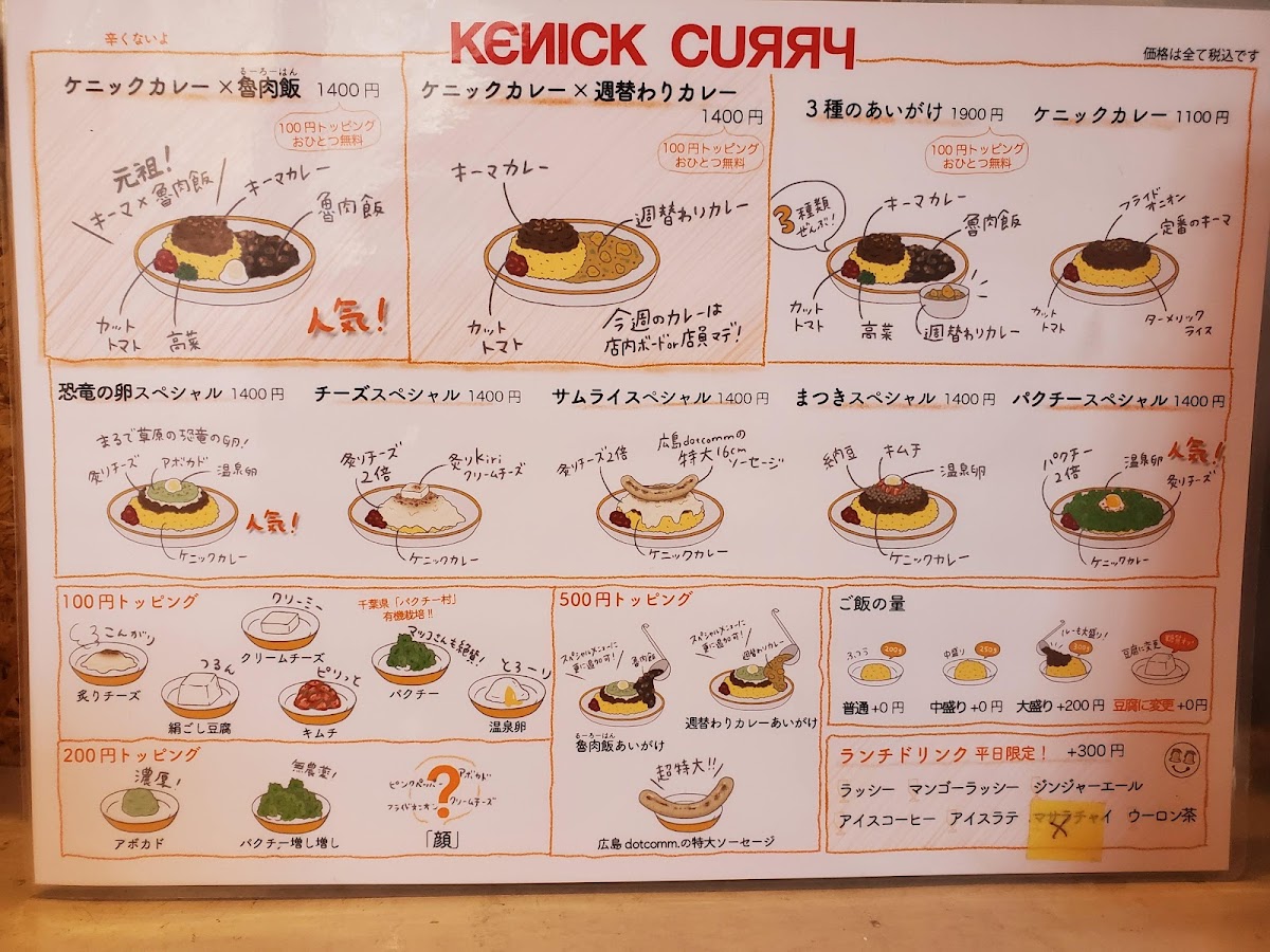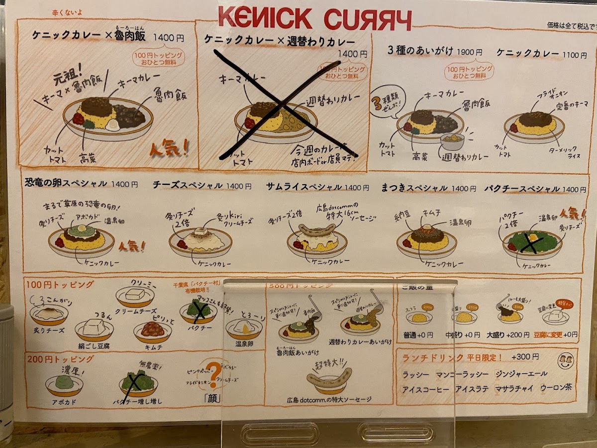 Menu tại Kenick Curry (Shibuya) tạo cảm giác “vừa vui mắt vừa đã miệng”, xoay quanh các phần curry đậm vị kết hợp topping và món ăn kèm theo phong cách rất riêng. Nếu muốn một bữa trưa nổi bật, ランチパクチースペシャル là lựa chọn đáng thử cho ai thích hương vị tươi, thơm đặc trưng của rau mùi. Nhóm “signature” gây ấn tượng mạnh nhất phải kể đến ケニックカレー恐竜の卵スペシャル với concept thú vị, và ケニックカレーチーズスペシャル dành cho tín đồ vị béo mặn của phô mai. Thực đơn cũng chiều chuộng fan ẩm thực Đài Loan với các lựa chọn như ケニックカレー ルーロー飯 và ケニックカレー 台湾ルーロー飯, đồng thời có các phần “ăn hai món một lần” cực hợp cho người muốn so sánh hương vị: ケニックカレー×魯肉飯の合いがけ, ケニックカレーと週替わりカレーのあいがけ, và ケニックカレーと日替わりカレーの合い掛け. Với người thích gọi nhiều vị trong một đĩa, 3種盛りカレー là lựa chọn hợp lý để trải nghiệm đa dạng. Về các set/phiên bản đặc biệt, 卑弥呼スペシャル và サムライスペシャル giúp bữa ăn có thêm điểm nhấn “đúng chất Kenick”. Phần topping cũng đáng khen vì dễ tuỳ biến: クリームチーズトッピング giúp tăng độ béo mượt, và nhóm lựa chọn giá 100円 như ケニッケカレー 温泉卵 orキヌゴシor炙りチーズorキムチ 1 100円 cho phép nâng cấp trải nghiệm theo khẩu vị (trứng onsen, đậu hũ mềm, phô mai khò, hoặc kimchi). Đồ uống đi kèm khá trọn vẹn: 生ビール hợp để “đã” hơn khi ăn curry, còn 濃厚マンゴーラッシー là lựa chọn mát, ngọt và cân bằng vị cay/đậm của món chính.