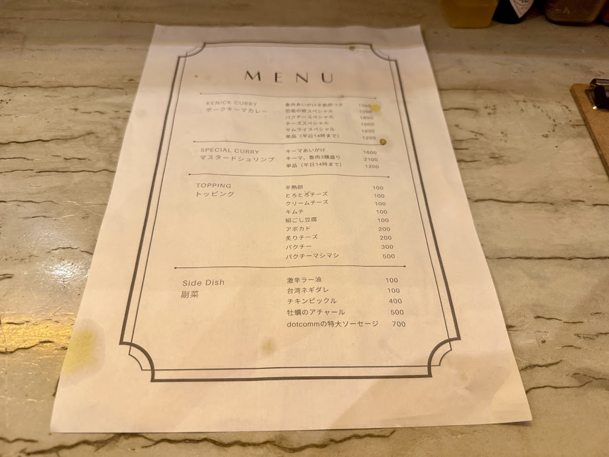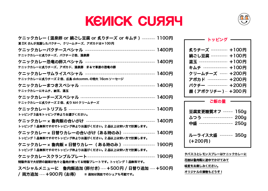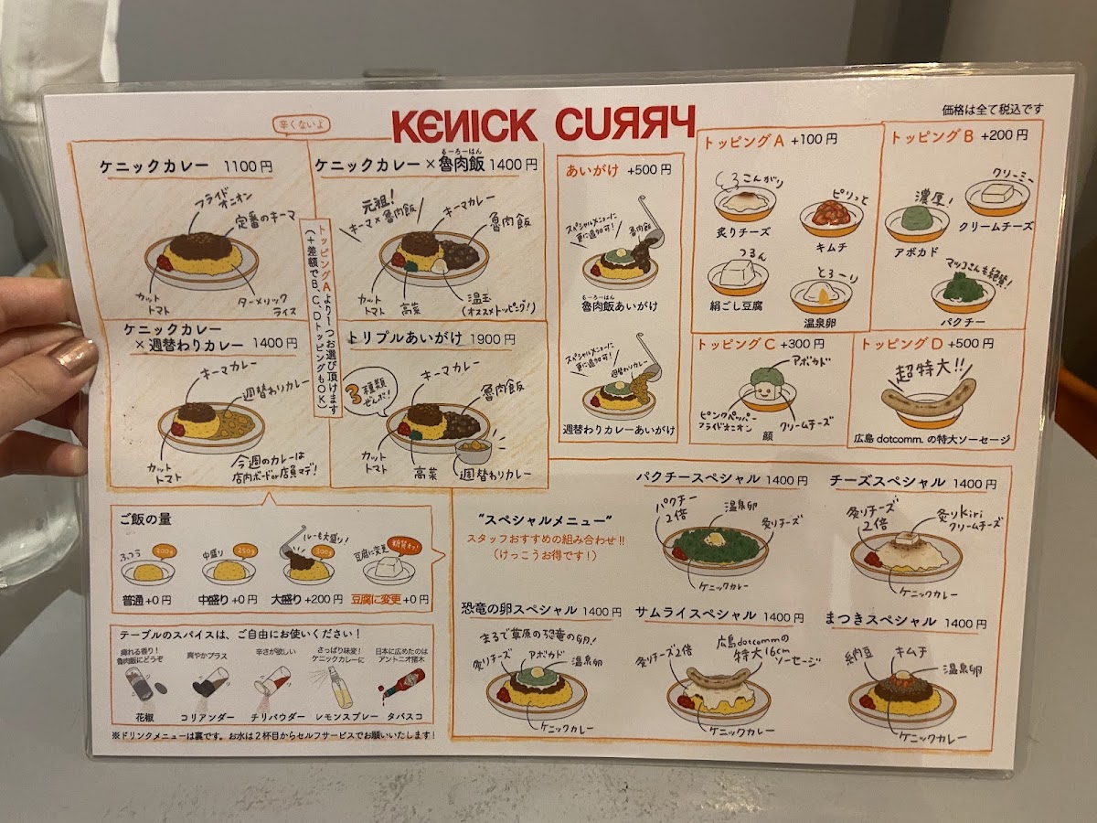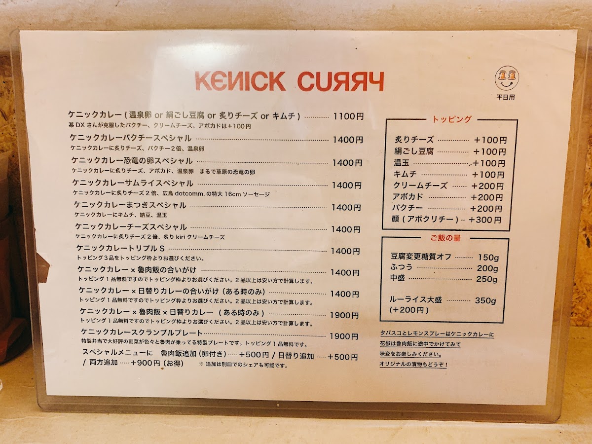 Menu tại Kenick Curry (Shibuya) tạo cảm giác “vừa vui mắt vừa đã miệng”, xoay quanh các phần curry đậm vị kết hợp topping và món ăn kèm theo phong cách rất riêng. Nếu muốn một bữa trưa nổi bật, ランチパクチースペシャル là lựa chọn đáng thử cho ai thích hương vị tươi, thơm đặc trưng của rau mùi. Nhóm “signature” gây ấn tượng mạnh nhất phải kể đến ケニックカレー恐竜の卵スペシャル với concept thú vị, và ケニックカレーチーズスペシャル dành cho tín đồ vị béo mặn của phô mai. Thực đơn cũng chiều chuộng fan ẩm thực Đài Loan với các lựa chọn như ケニックカレー ルーロー飯 và ケニックカレー 台湾ルーロー飯, đồng thời có các phần “ăn hai món một lần” cực hợp cho người muốn so sánh hương vị: ケニックカレー×魯肉飯の合いがけ, ケニックカレーと週替わりカレーのあいがけ, và ケニックカレーと日替わりカレーの合い掛け. Với người thích gọi nhiều vị trong một đĩa, 3種盛りカレー là lựa chọn hợp lý để trải nghiệm đa dạng. Về các set/phiên bản đặc biệt, 卑弥呼スペシャル và サムライスペシャル giúp bữa ăn có thêm điểm nhấn “đúng chất Kenick”. Phần topping cũng đáng khen vì dễ tuỳ biến: クリームチーズトッピング giúp tăng độ béo mượt, và nhóm lựa chọn giá 100円 như ケニッケカレー 温泉卵 orキヌゴシor炙りチーズorキムチ 1 100円 cho phép nâng cấp trải nghiệm theo khẩu vị (trứng onsen, đậu hũ mềm, phô mai khò, hoặc kimchi). Đồ uống đi kèm khá trọn vẹn: 生ビール hợp để “đã” hơn khi ăn curry, còn 濃厚マンゴーラッシー là lựa chọn mát, ngọt và cân bằng vị cay/đậm của món chính.